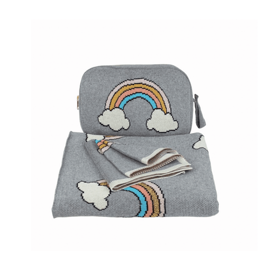 Personalized Baby Travel Set Grey / Gold Rainbow 3 Piece Knitted