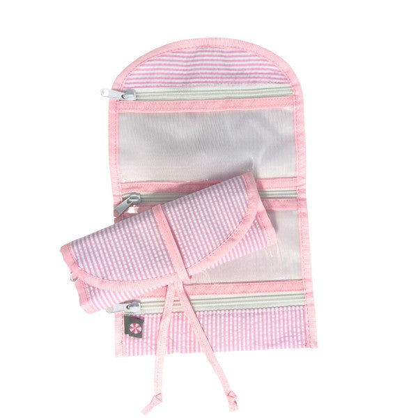The Hang Around is truly the perfect organizer. Sporting a velcro loop hanger & 3 zip pockets with 4 wipeable dividers, you can store travel items, jewelry, makeup, or even diaper bag contents all in one compact bag! This bag is carry-on friendly by folding flat and securing with the velcro fastener.
